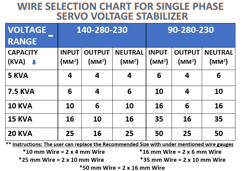 There are several misconceptions regarding sizing of Neutral wire. In general, we take half of the size of the phase diameter of the wire, i.e. if the wire size is 10mm2 than we can plan for either 4mm2 or 6mm2 for the neutral wire. As in most cases neutral is just used to complete the circuit. This can even be true for normal cases. However, in Servo Voltage Stabilizer the case is totally different. Servo Stabilizer basically corrects the individual phase voltage with respect to neutral and we always suggest regarding the size of neutral wire, to use the similar diameter that we used in case of output phase wire (as recommended). This may appeal false in case, if input voltage comes normal / at higher end. However, there may be certain conditions where selecting lower capacity neutral wire may be dangerous. These are: 1- If load attached in three phase servo stabilizer is in single phase only and not properly distributed in three phase. 2- If input voltage is coming low.